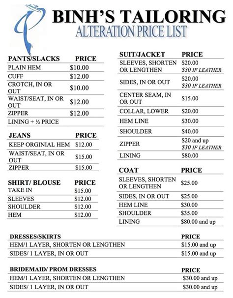 tailoring items list pdf